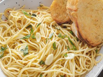 Mantequilla, ajo rostizado, albahaca fresca y un toque de chile quebrado.